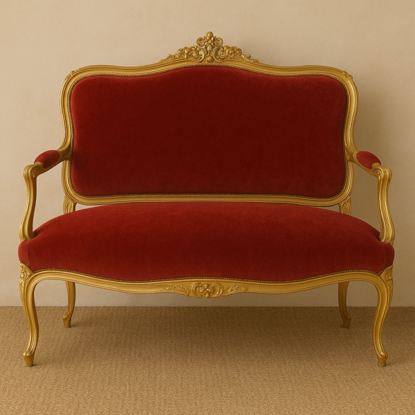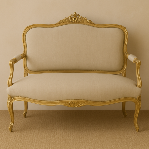 Ce canapé est un authentique modèle de style Napoléon III, réalisé en bois doré selon la plus pure tradition française. La structure est sculptée à la main, révélant un travail raffiné sur les courbes et les ornements décoratifs. La dorure est effectuée à la feuille d’or 24 carats, un procédé prestigieux réservé aux pièces de grande valeur. Avant la pose de l’or, le bois est préparé avec entre 10 et 16 couches de blanc de Meudon, mélangé à de la colle de peau de lapin, garantissant une surface parfaitement lisse et durable. Vient ensuite l’application de l’assiette, qui sert de base colorée pour recevoir la feuille d’or. Celle-ci est ensuite posée délicatement, puis brunie à l’agate pour faire ressortir tout son éclat et ses reflets lumineux. Cette technique ancestrale, d’une grande exigence, témoigne d’un savoir-faire transmis par les maîtres doreurs. Le résultat est une dorure profonde, chaude et vibrante, qui sublime les volumes du bois sculpté. L’assise et le dossier étaient traditionnellement garnis de tapisserie d’Aubusson, tissée à la main, avec des motifs floraux caractéristiques de l’époque. L’ensemble illustre parfaitement l’élégance et le raffinement décoratif du XIXe siècle français, faisant de ce canapé une pièce patrimoniale rare et précieuse.